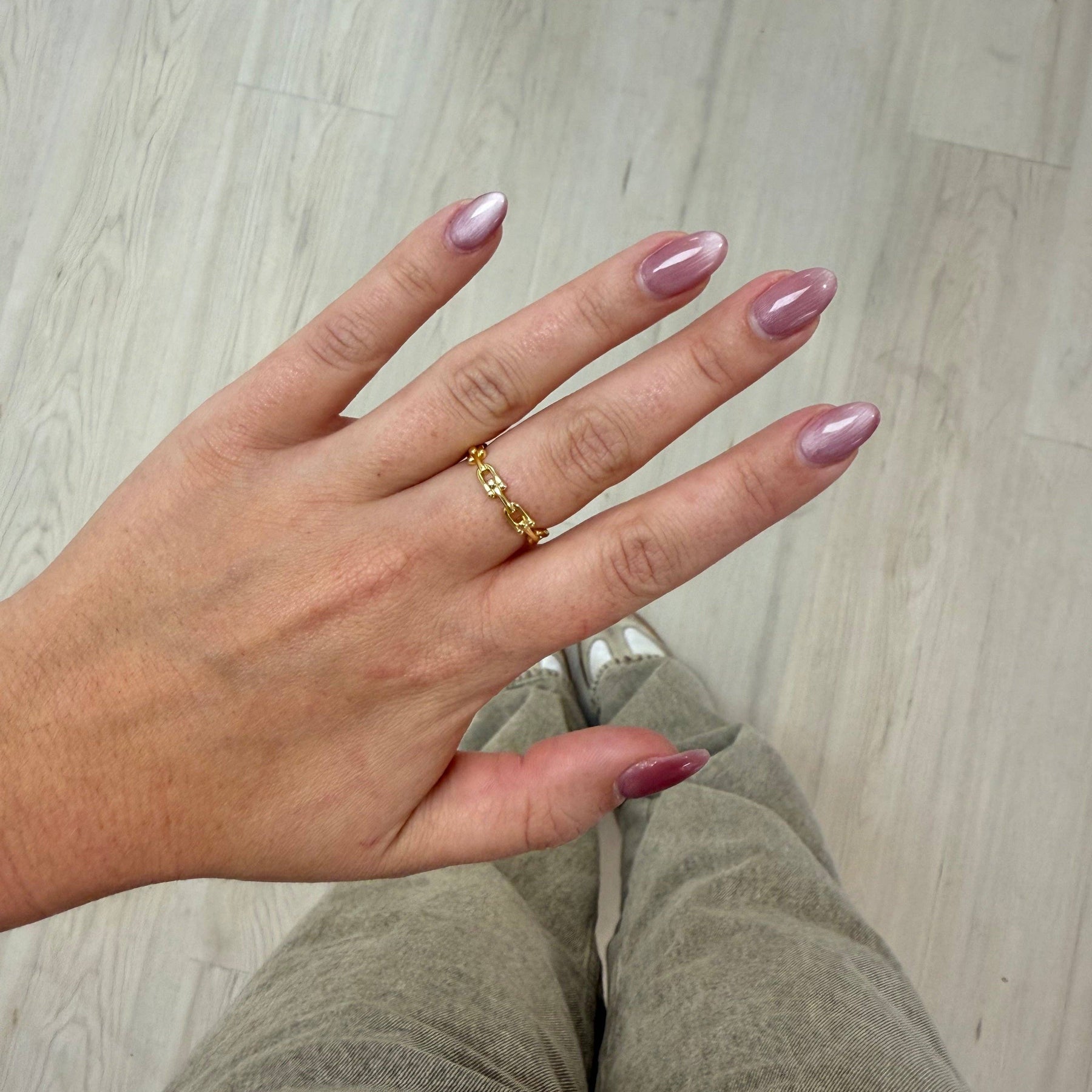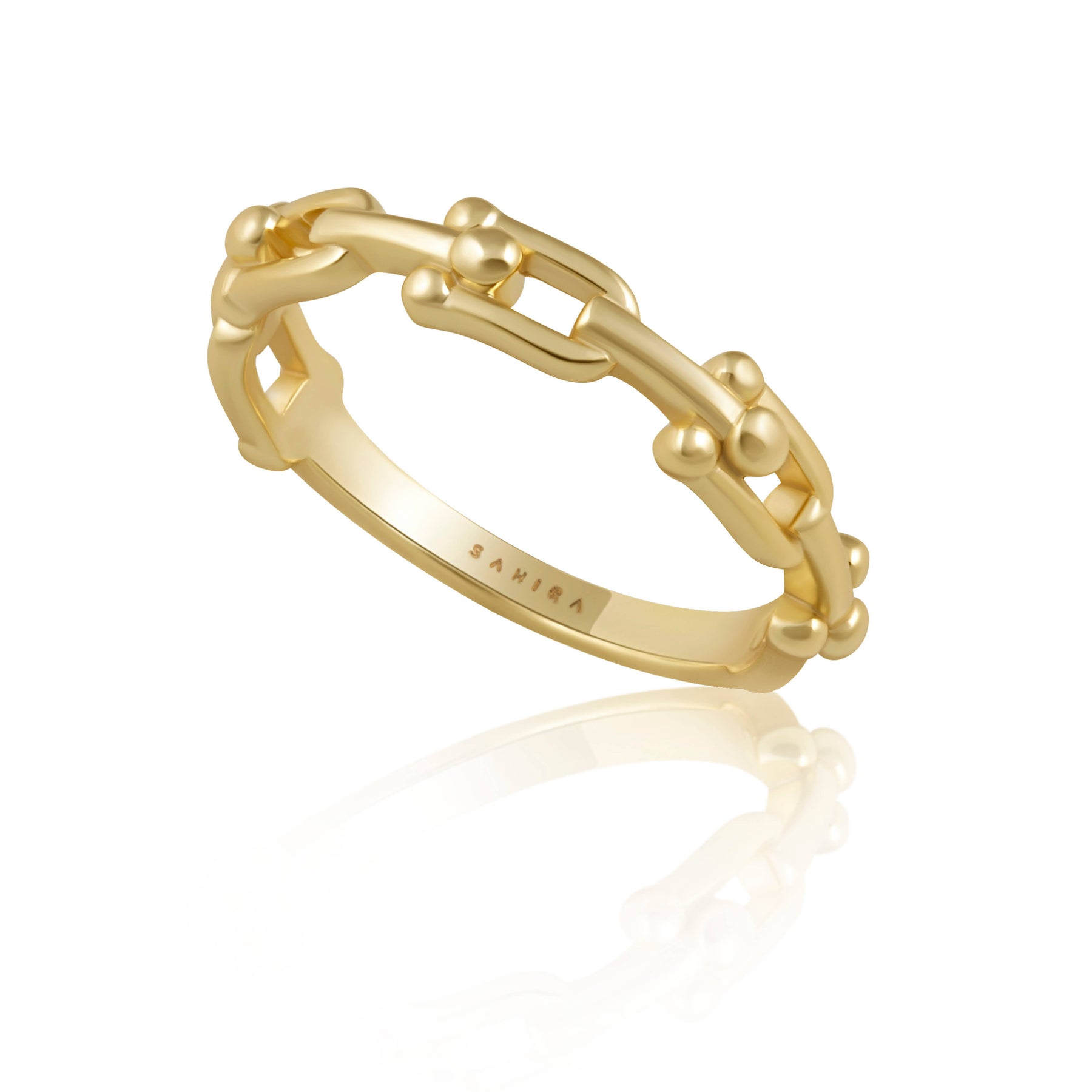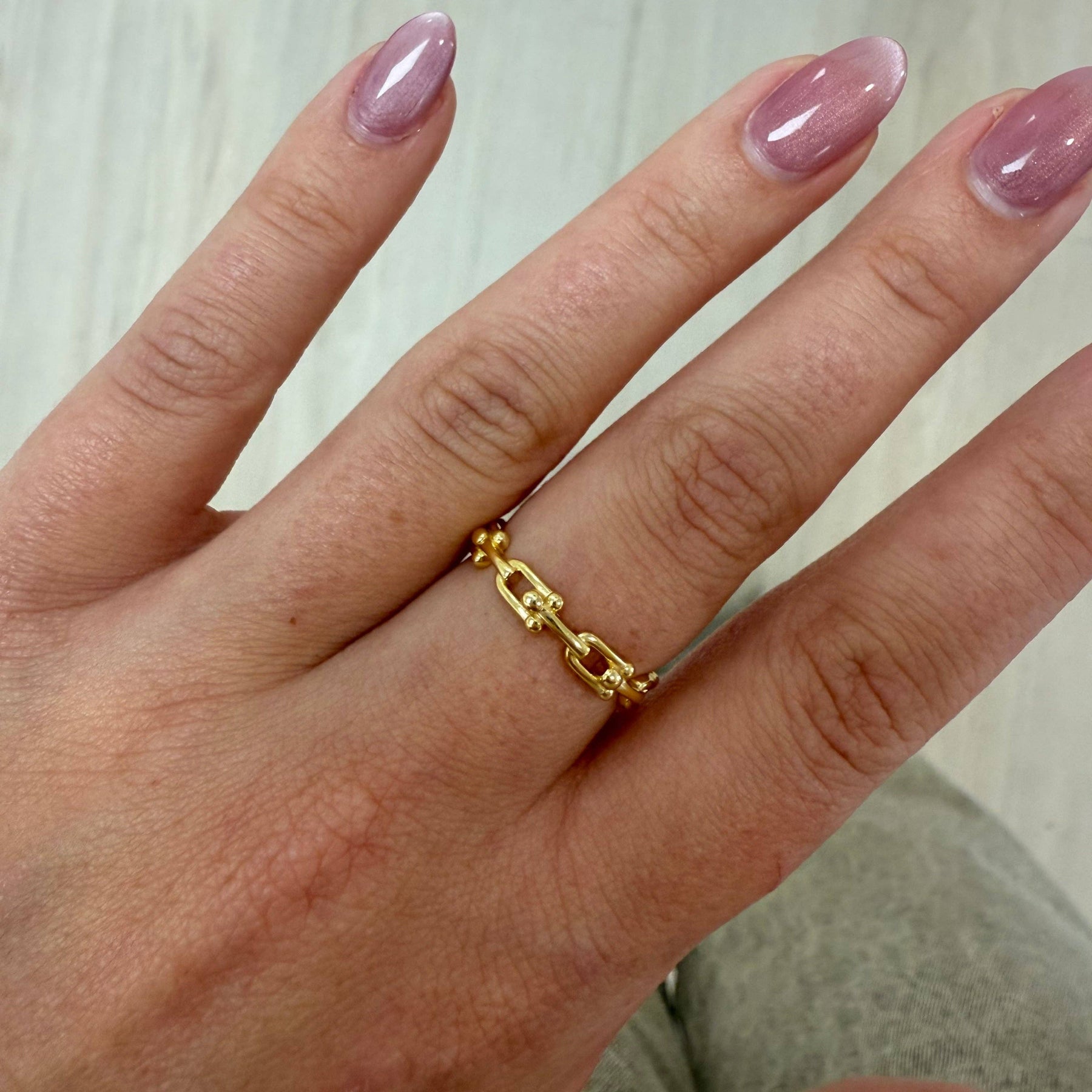 The interlocking U-shaped links create a beautiful pattern that catches the light as you move. Versatile enough for everyday wear while still making a statement, this ring pairs perfectly with both casual and formal outfits.