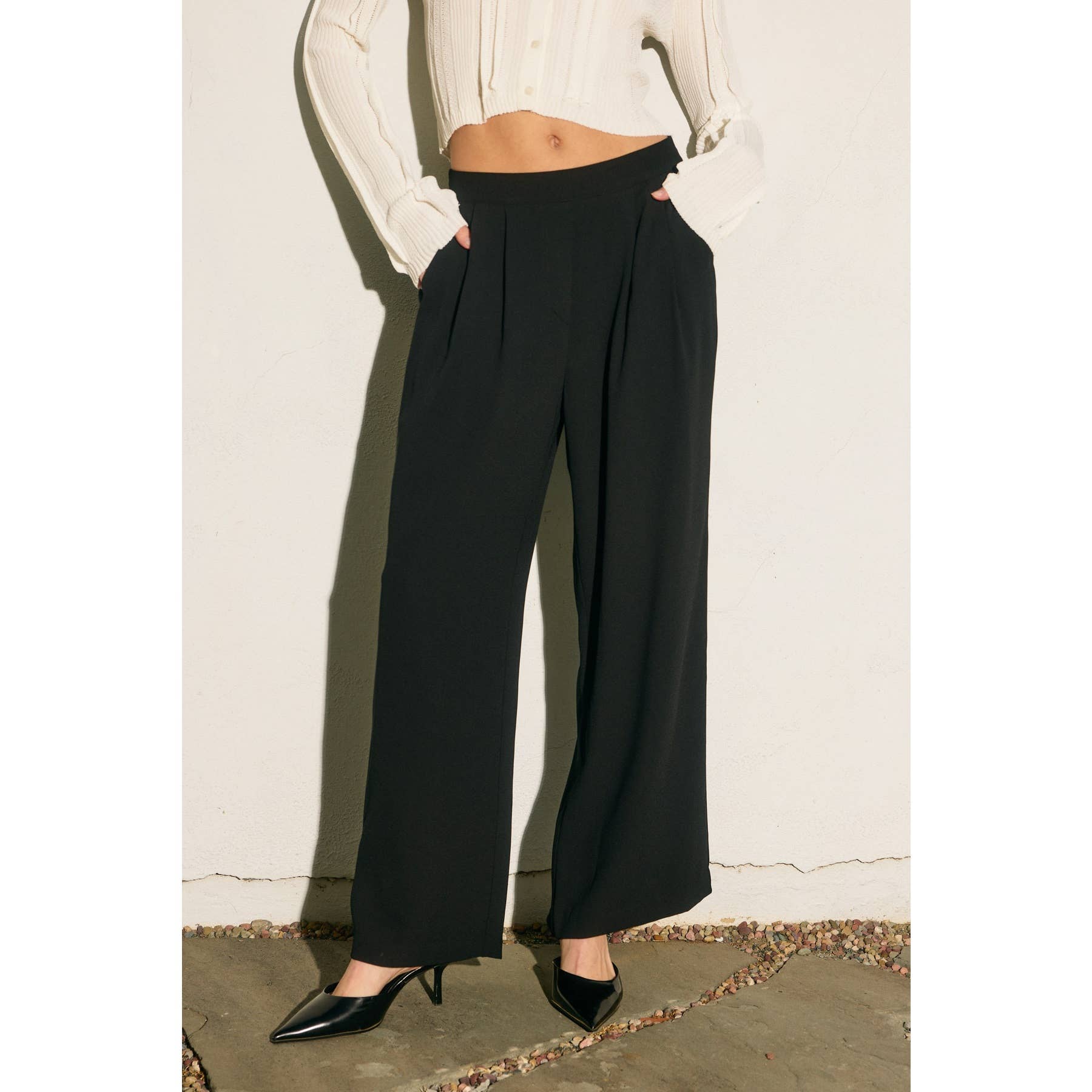 Basic solid pants slightly dressy yet comfortable - ready for the office or everyday activities. Model is 5'7" and wearing size Small. - Pull on design - Decorative fly - Elasticized back waistband - Wide legs - Side pockets - Back top-stitiched jetted unfunctional pockets -