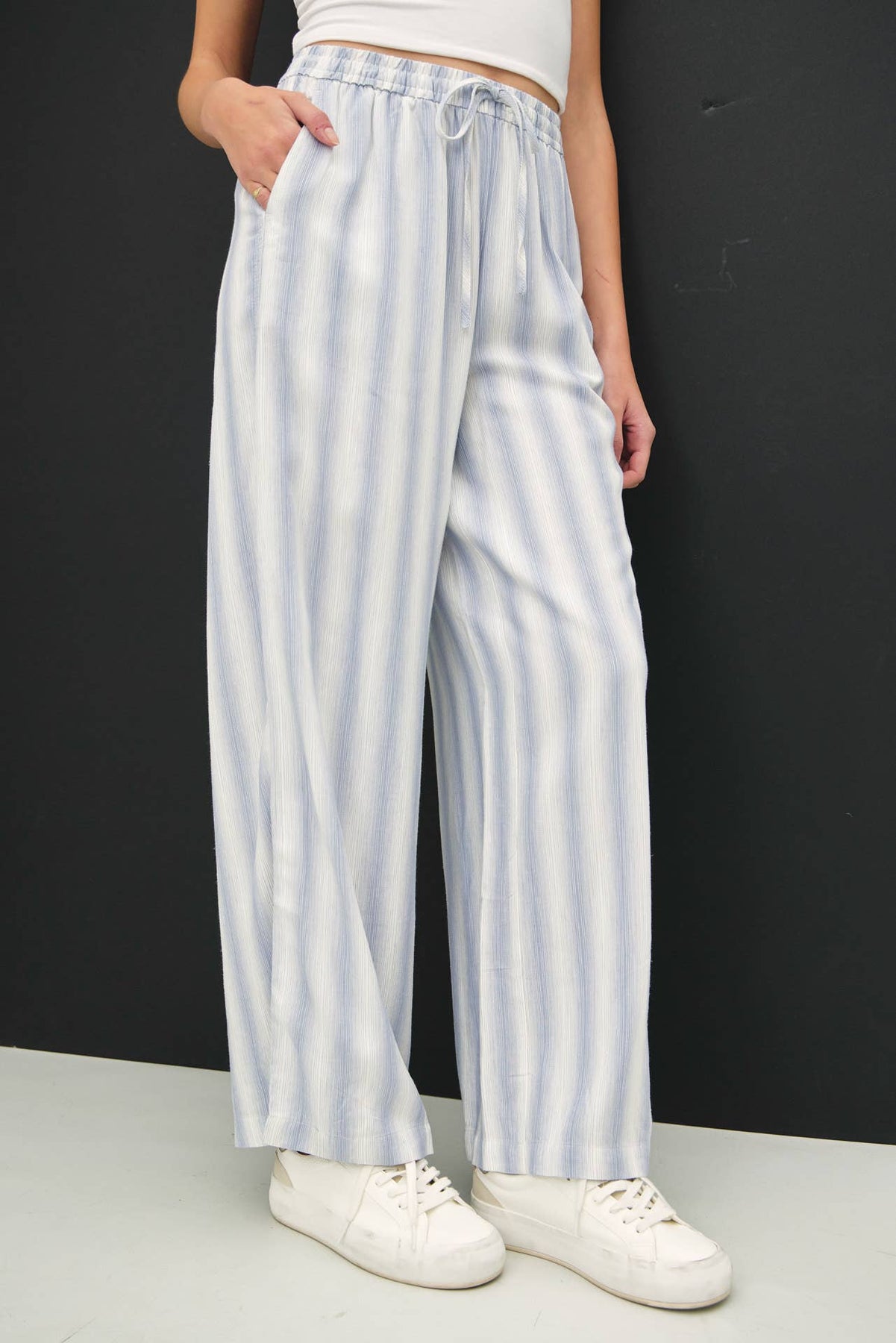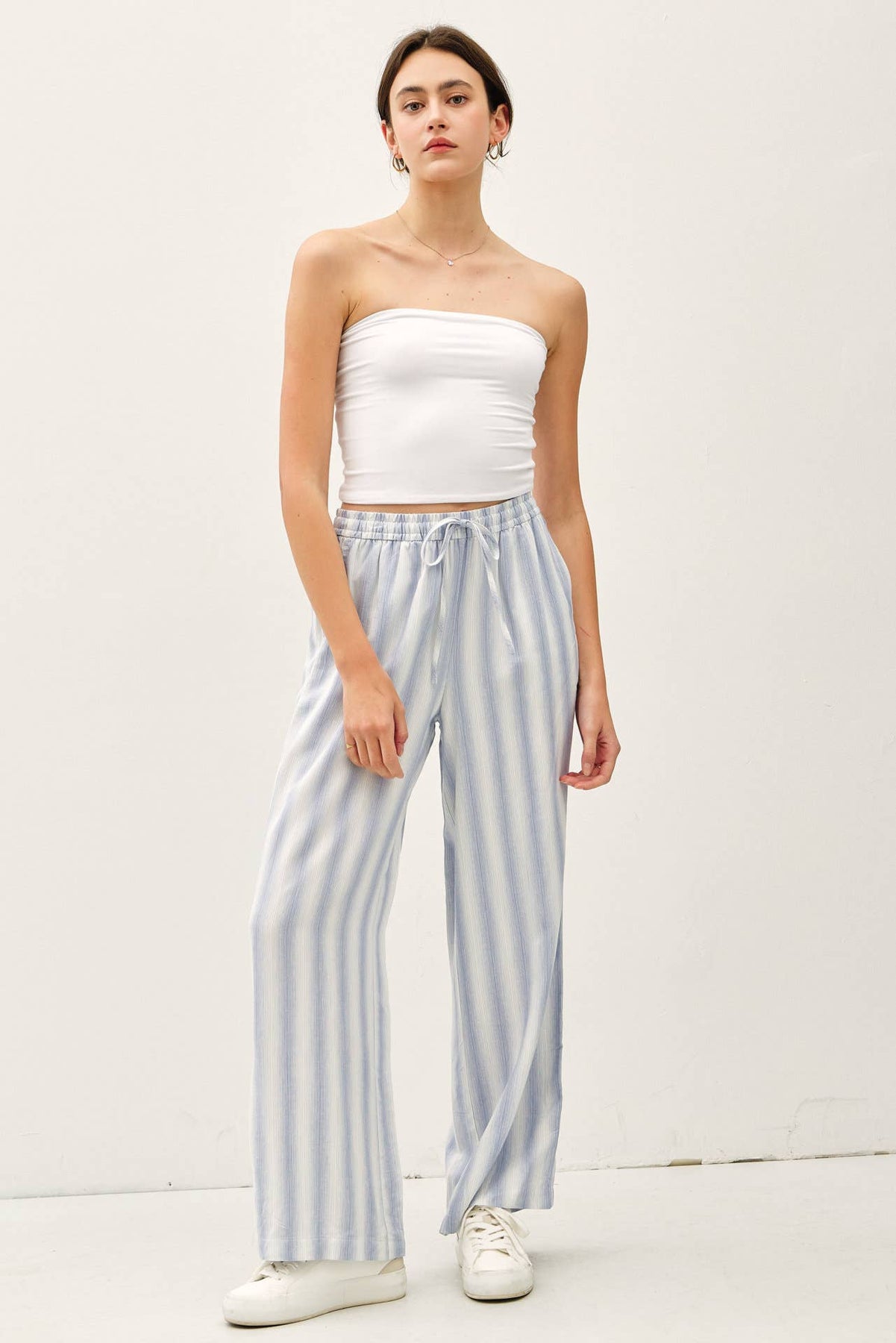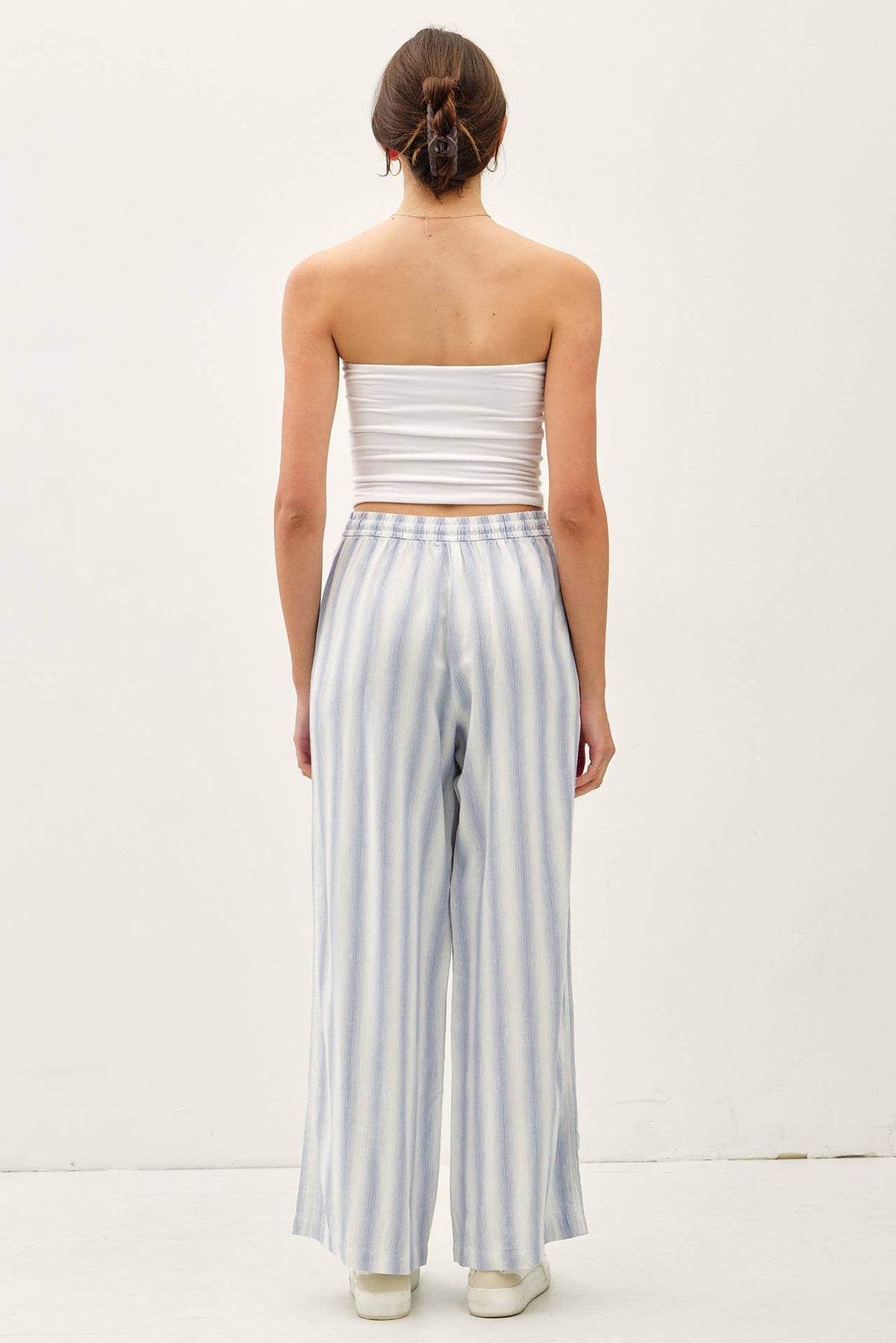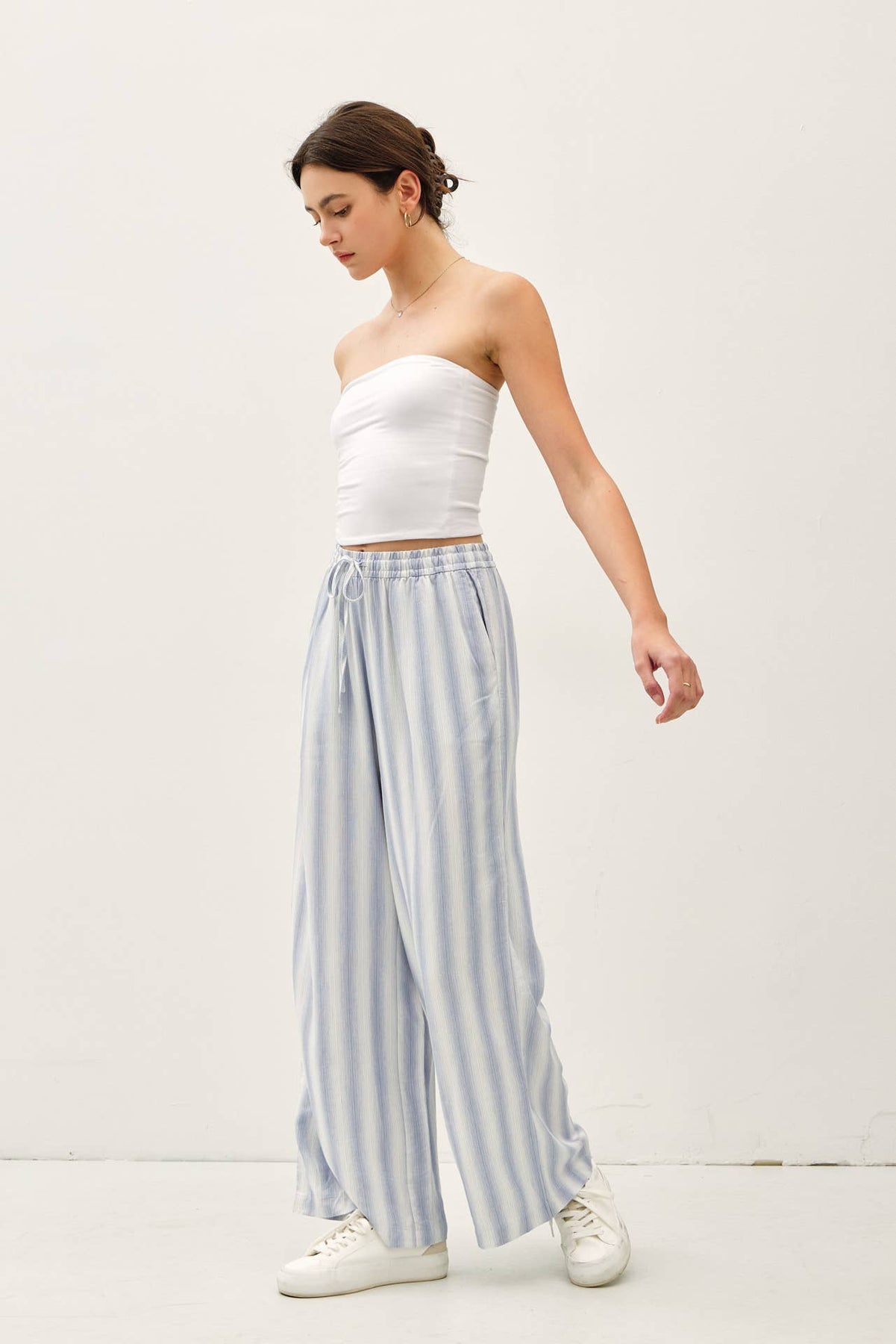 OMBRE STRIPED LINEN BLEND WIDE LEG PANTS W/ DRAWSTRING ELASTIC WAIST