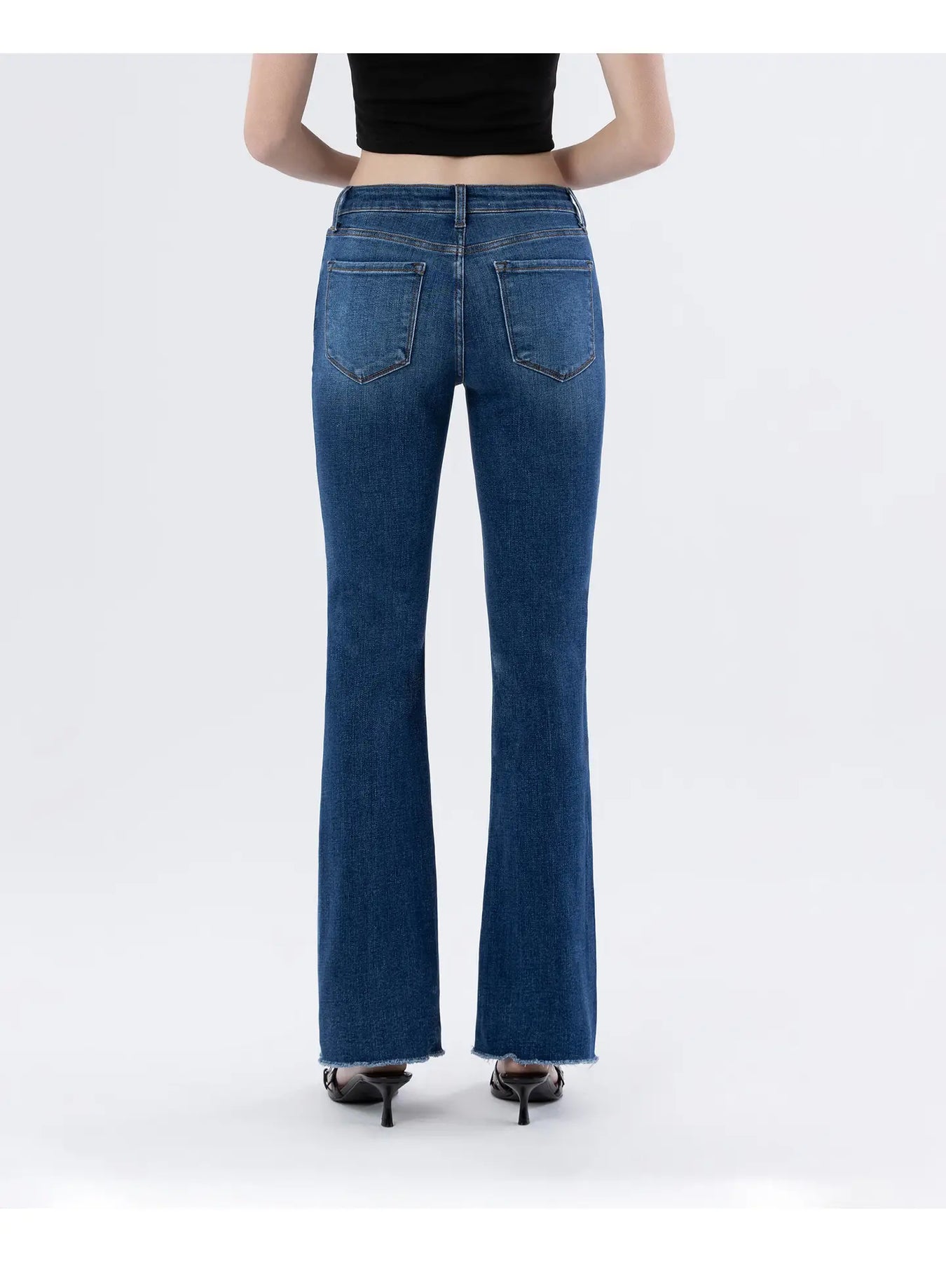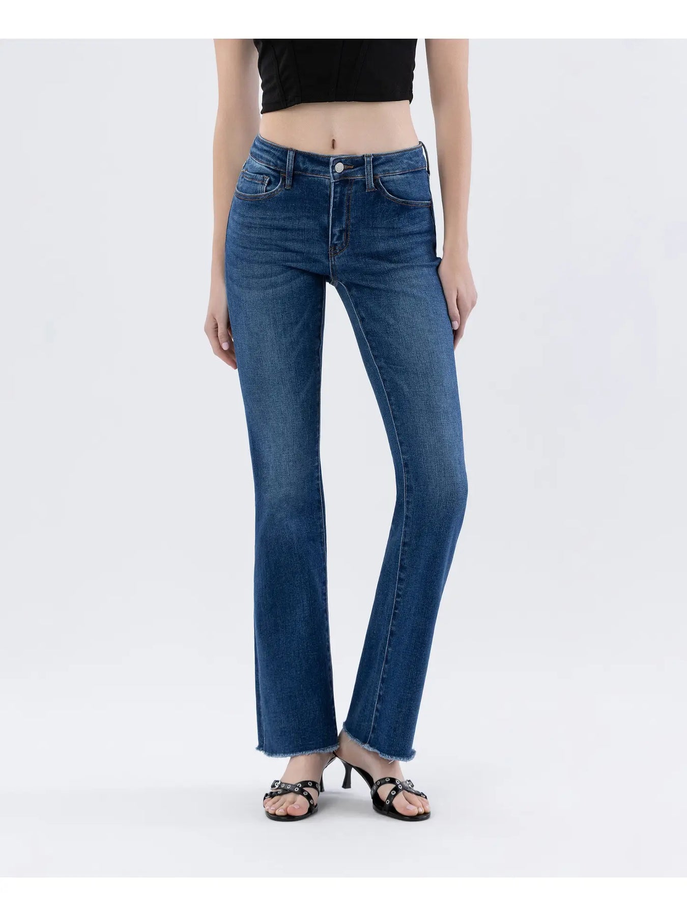 Mid rise raw hem dark wash bootcut jeans Comfort stretch denim, mid rise waist, 5 pockets, raw hem, full length, dark wash, bootcut jeans F. Rise: 9 1/2" / inseam: 32" / leg opening: 16 1/2"