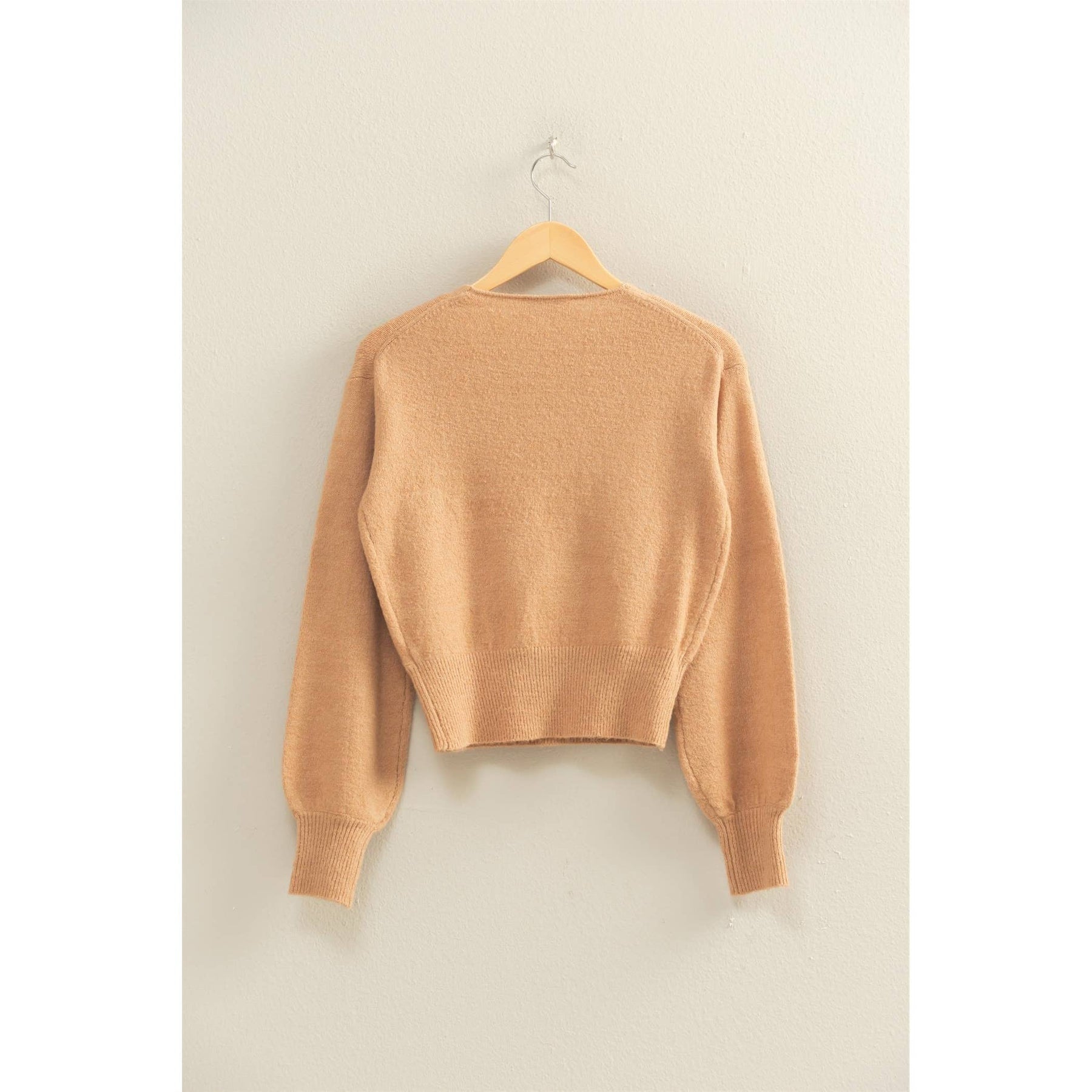 This surplice knit sweater features a flattering V-neckline with an elegant overlapping front. Designed with a relaxed drop shoulder and finished with ribbed cuffs and hem, the fitted waistband adds subtle structure. Perfect for pairing with jeans or skirts, it's ideal for cozy evenings and casual outings alike. 72% acrylic 25% polyester 3% spandex