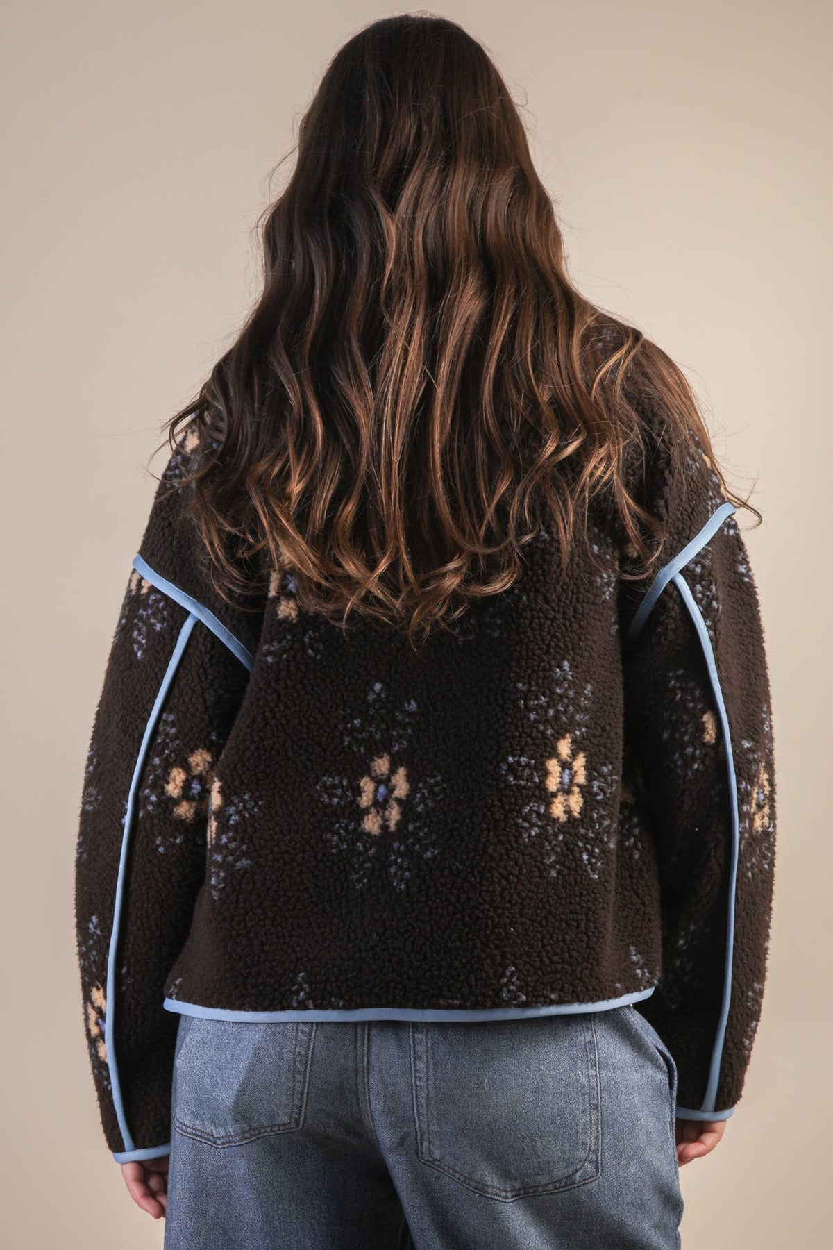 Overszied Floral Printed Casual Fleece Jacket - High Neck - Front Zip UP - Long Sleeve - Drop Shoulder - Side Pockets
