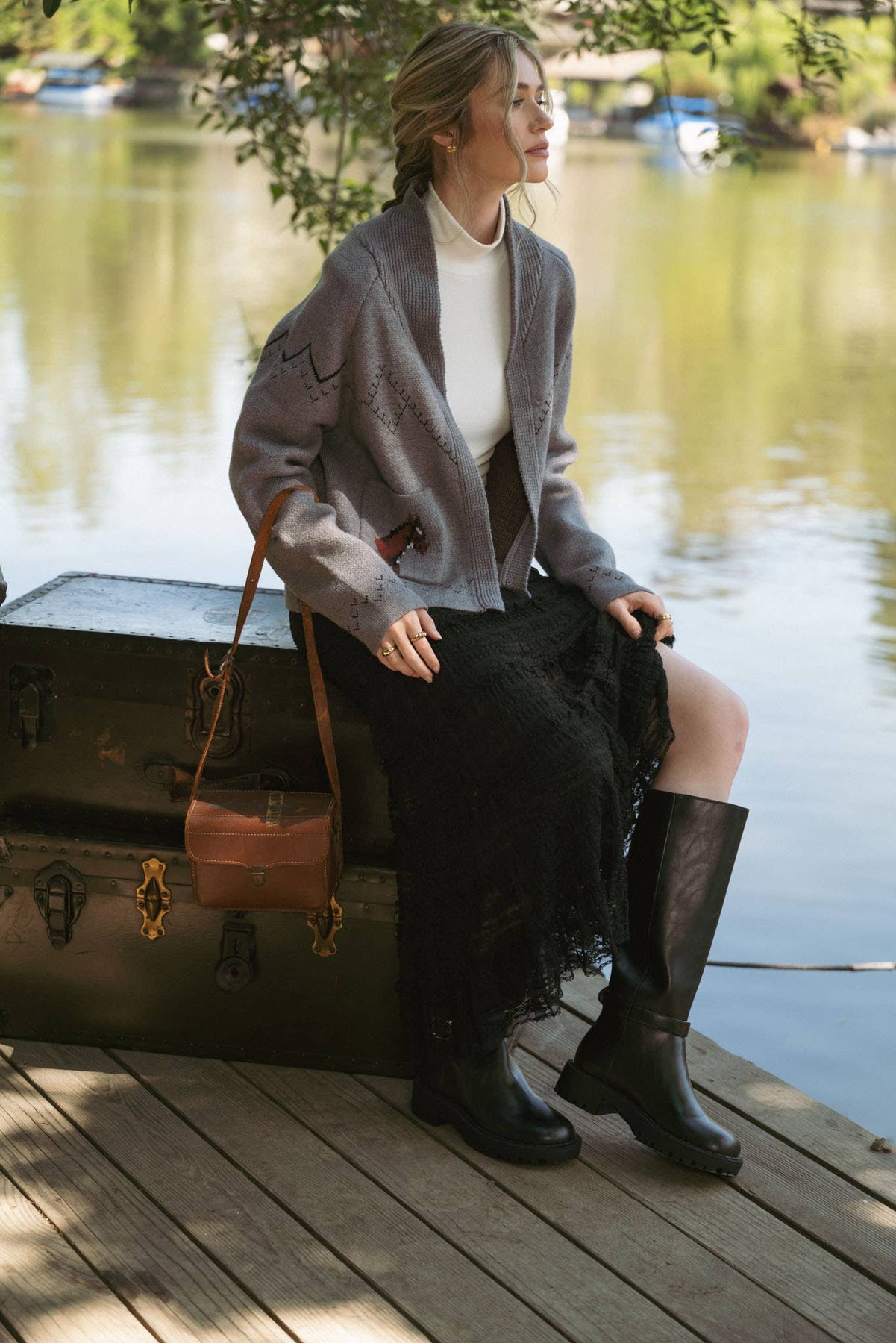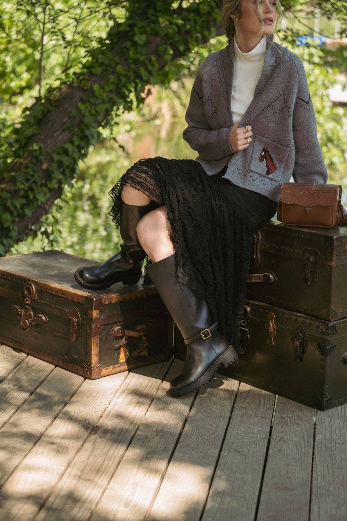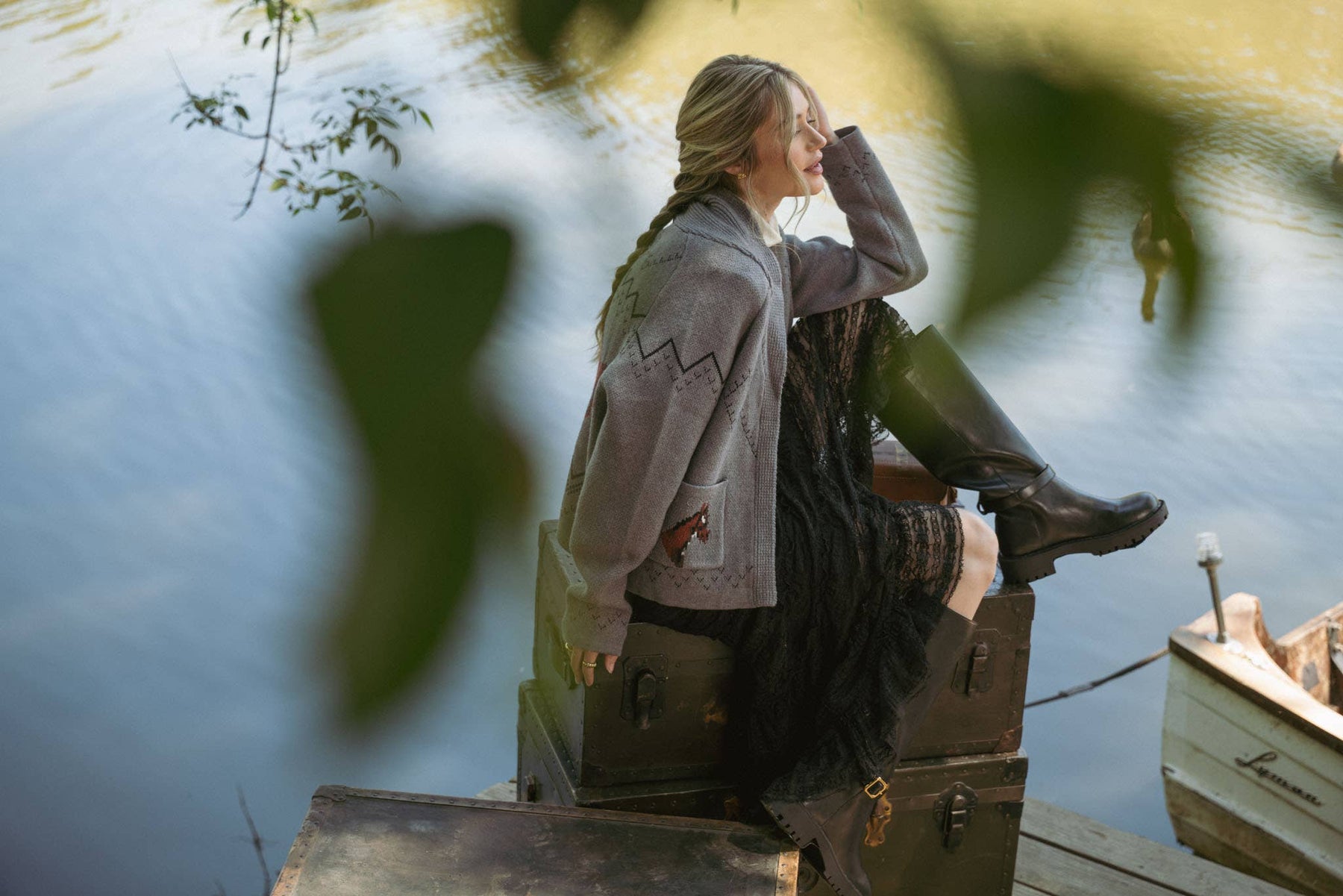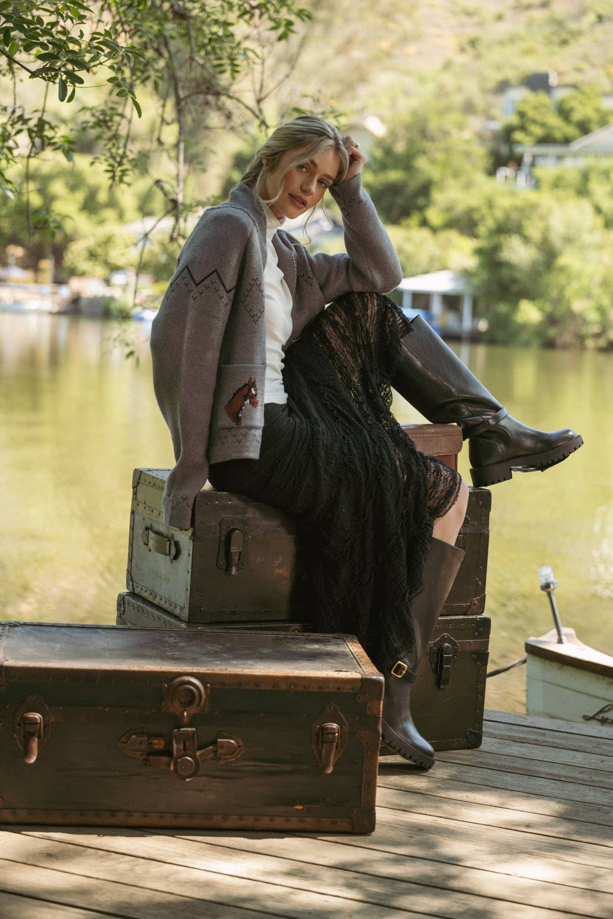 + Horse knit sweater cardigan + Shawl collar + Open front + Raglan seam long sleeves + Front patch pockets with horse motif + Relaxed fit + Horse motif on back + Model is 5' 10.5" 32-24-36 and wears a S