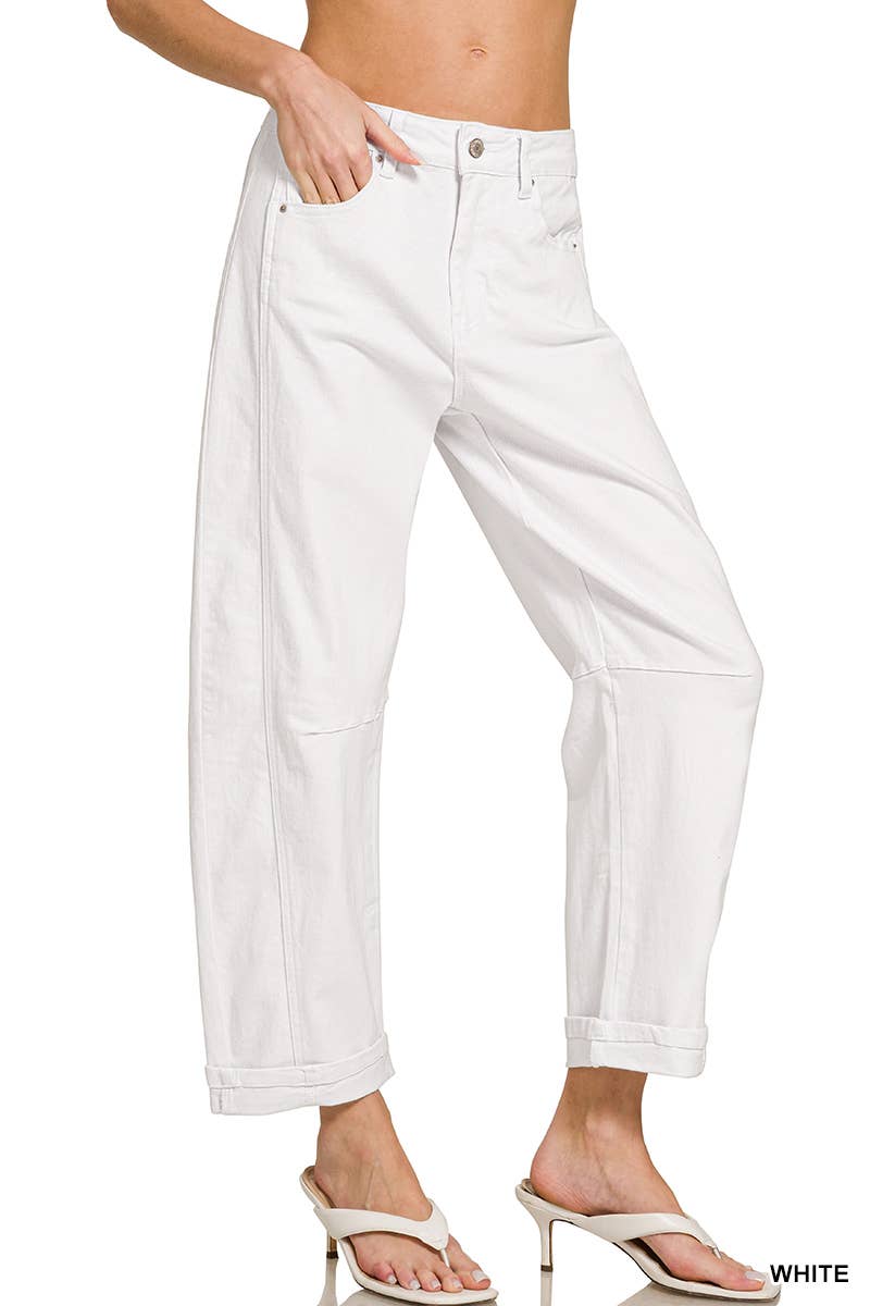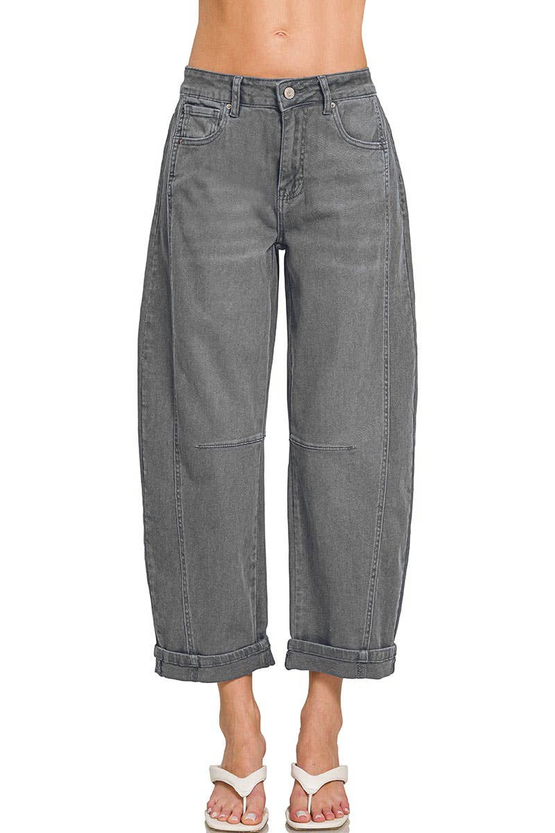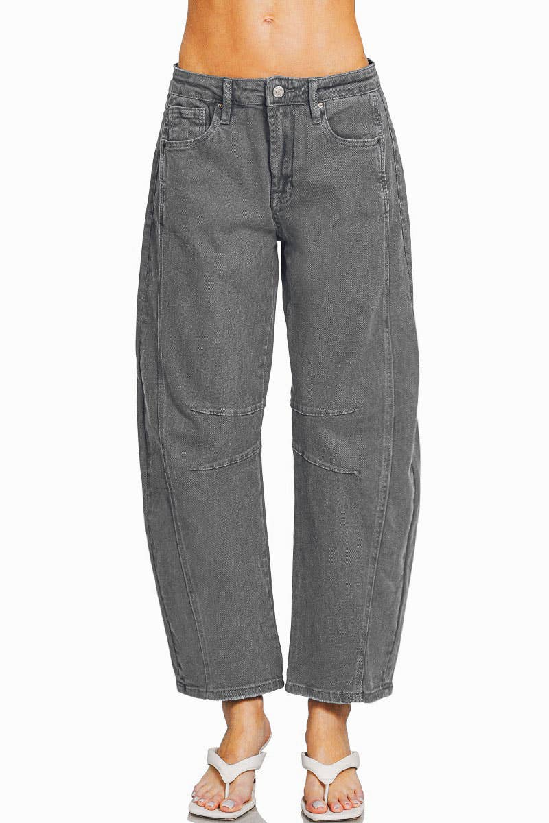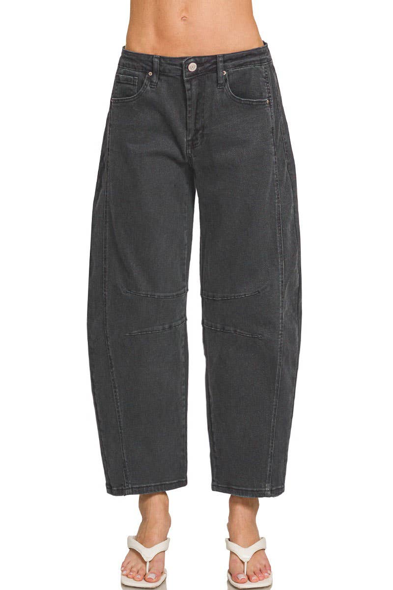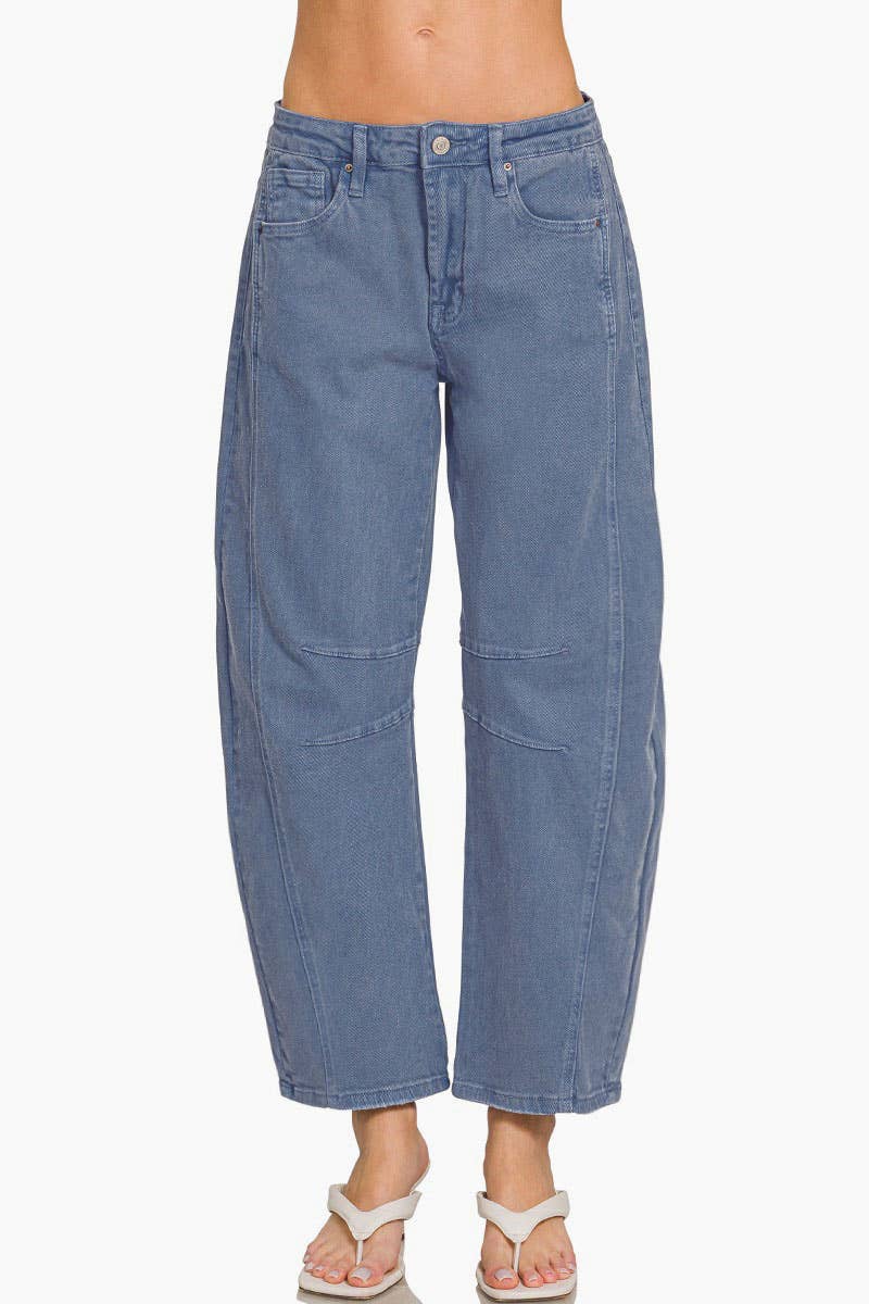 FRONT RISE: 10.5", INSEAM: 25.5" approx. LEG OPENING: 16" approx. -MEASURED FROM SIZE SMALL Material: 97%COTTON, 3%SPANDEX SI-29341 High Rise Barrel Denim Jeans (97% COTTON, 3% SPANDEX)
