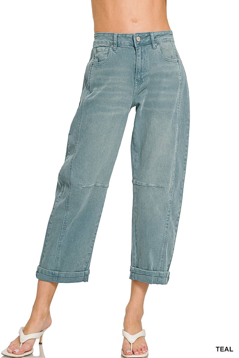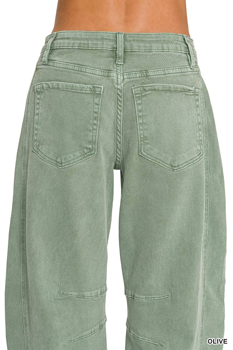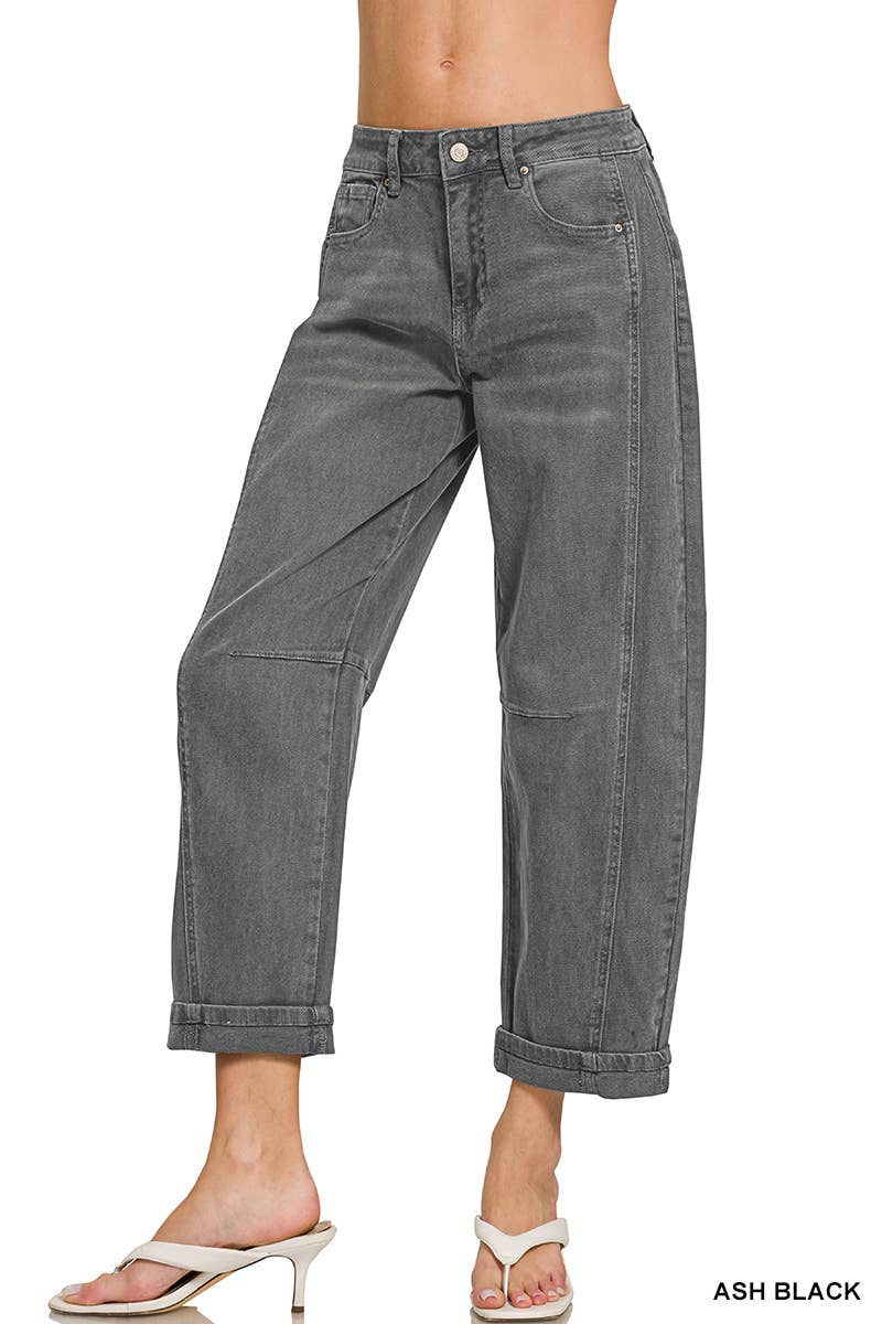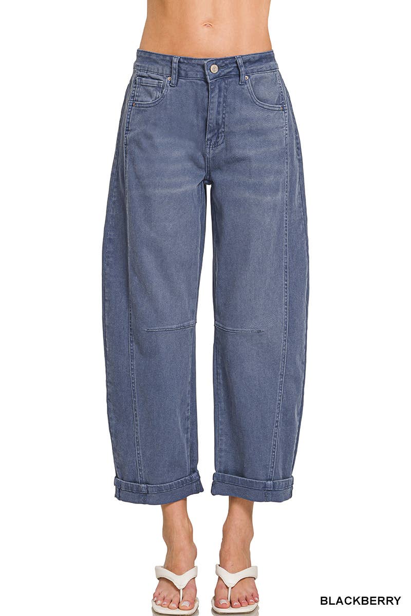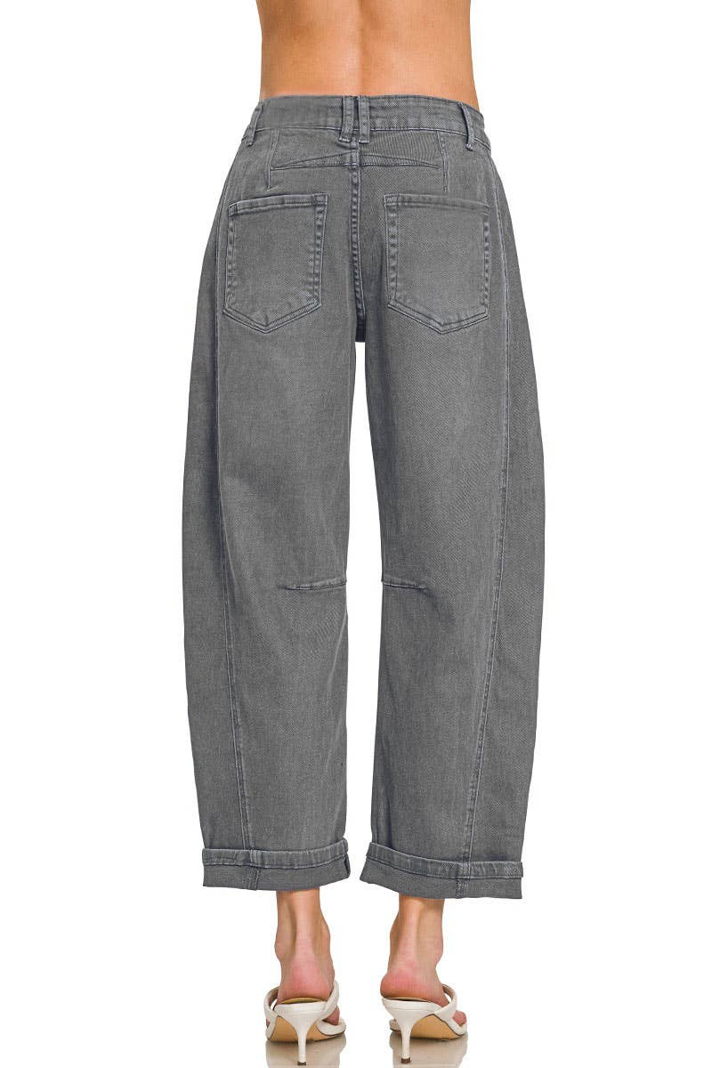 FRONT RISE: 10.5", INSEAM: 25.5" approx. LEG OPENING: 16" approx. -MEASURED FROM SIZE SMALL Material: 97%COTTON, 3%SPANDEX SI-29341 High Rise Barrel Denim Jeans (97% COTTON, 3% SPANDEX)