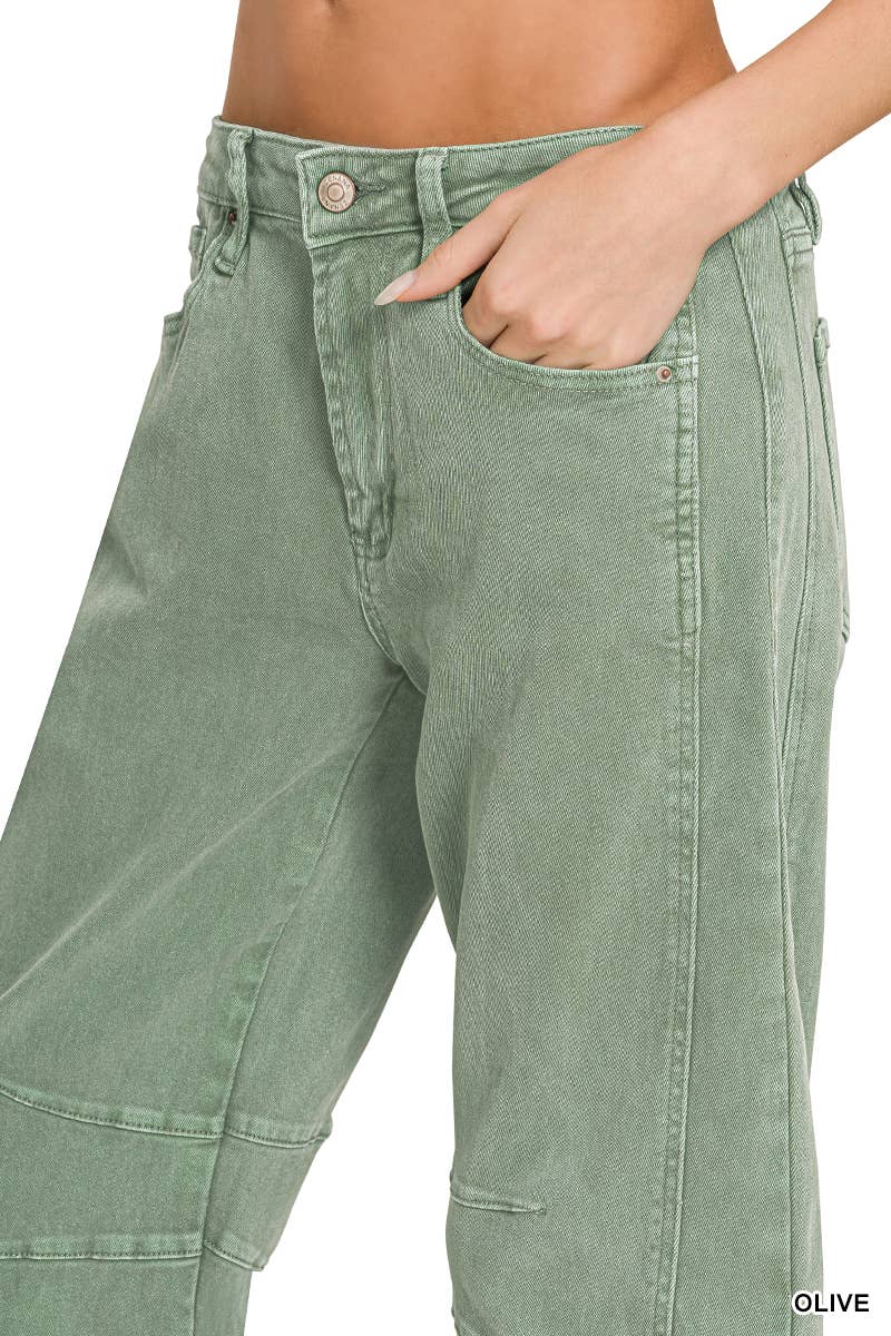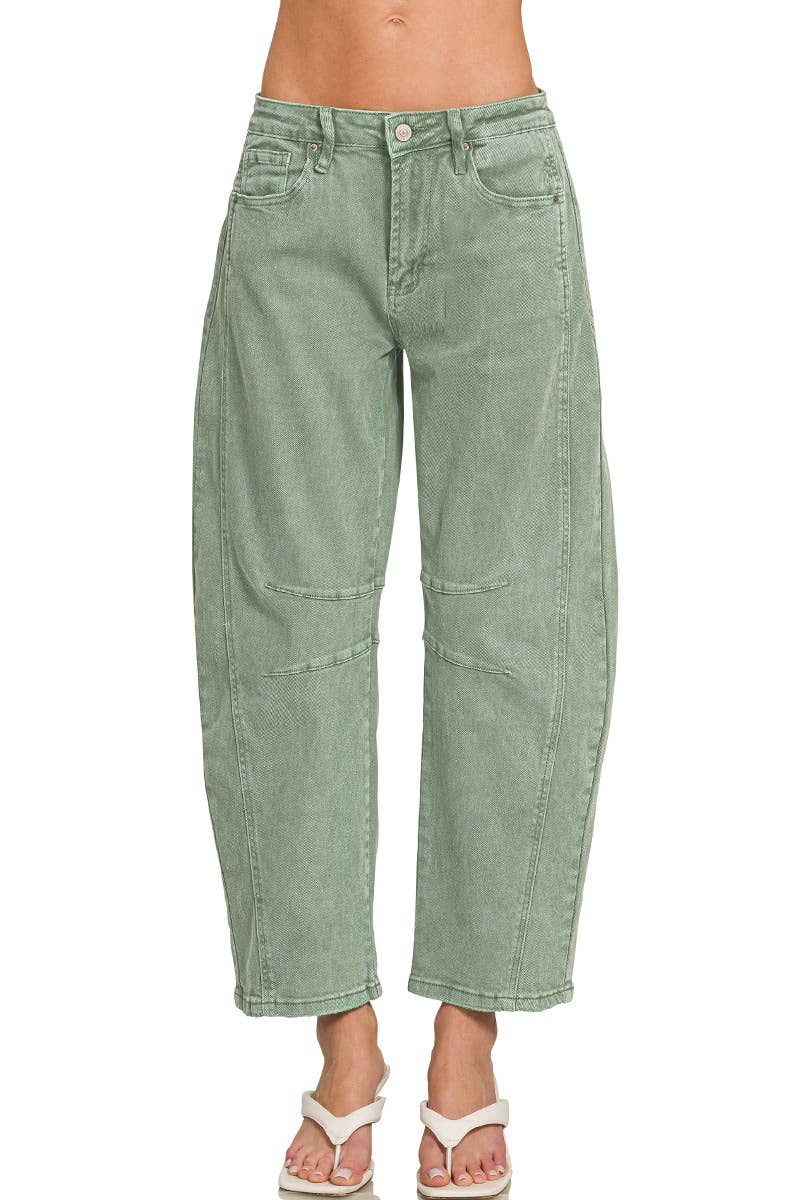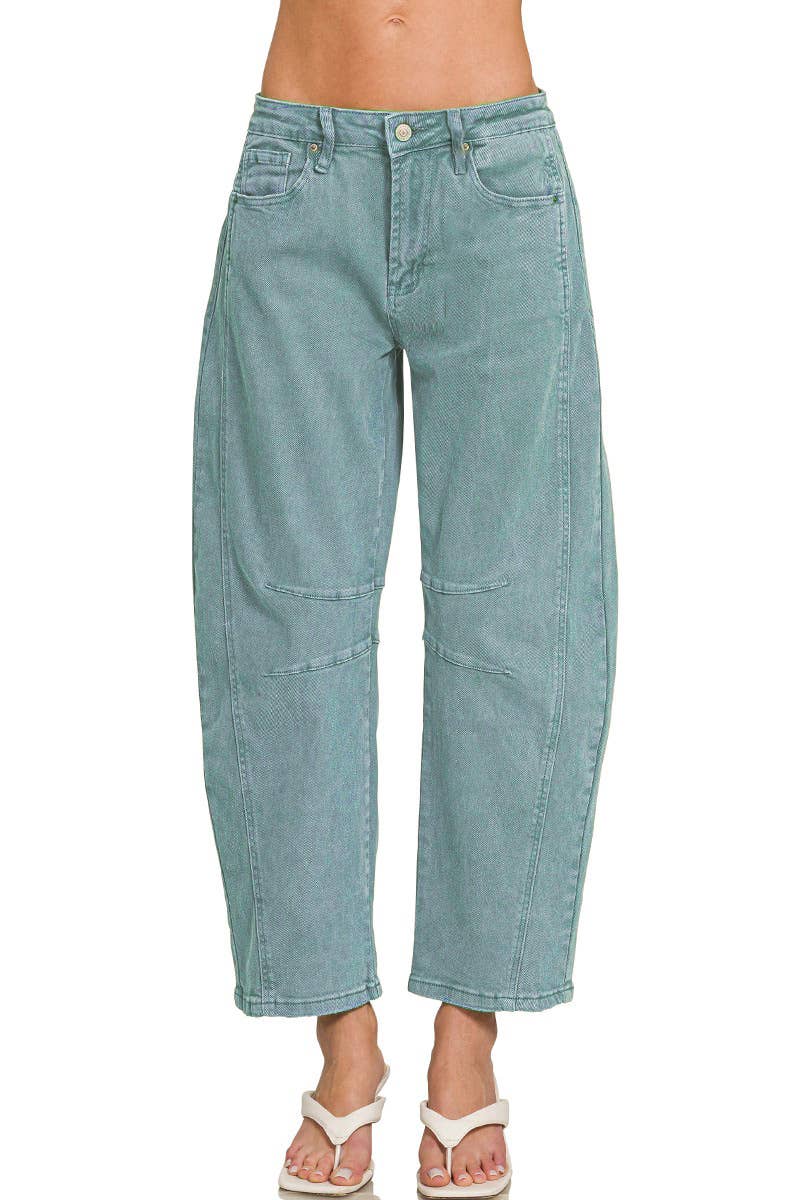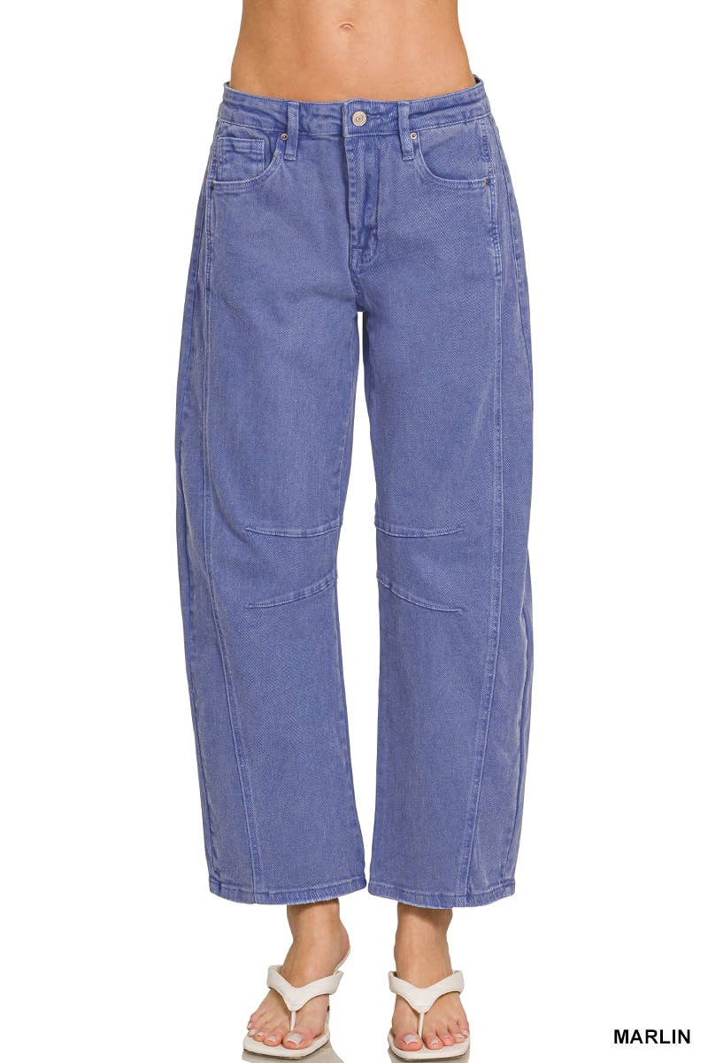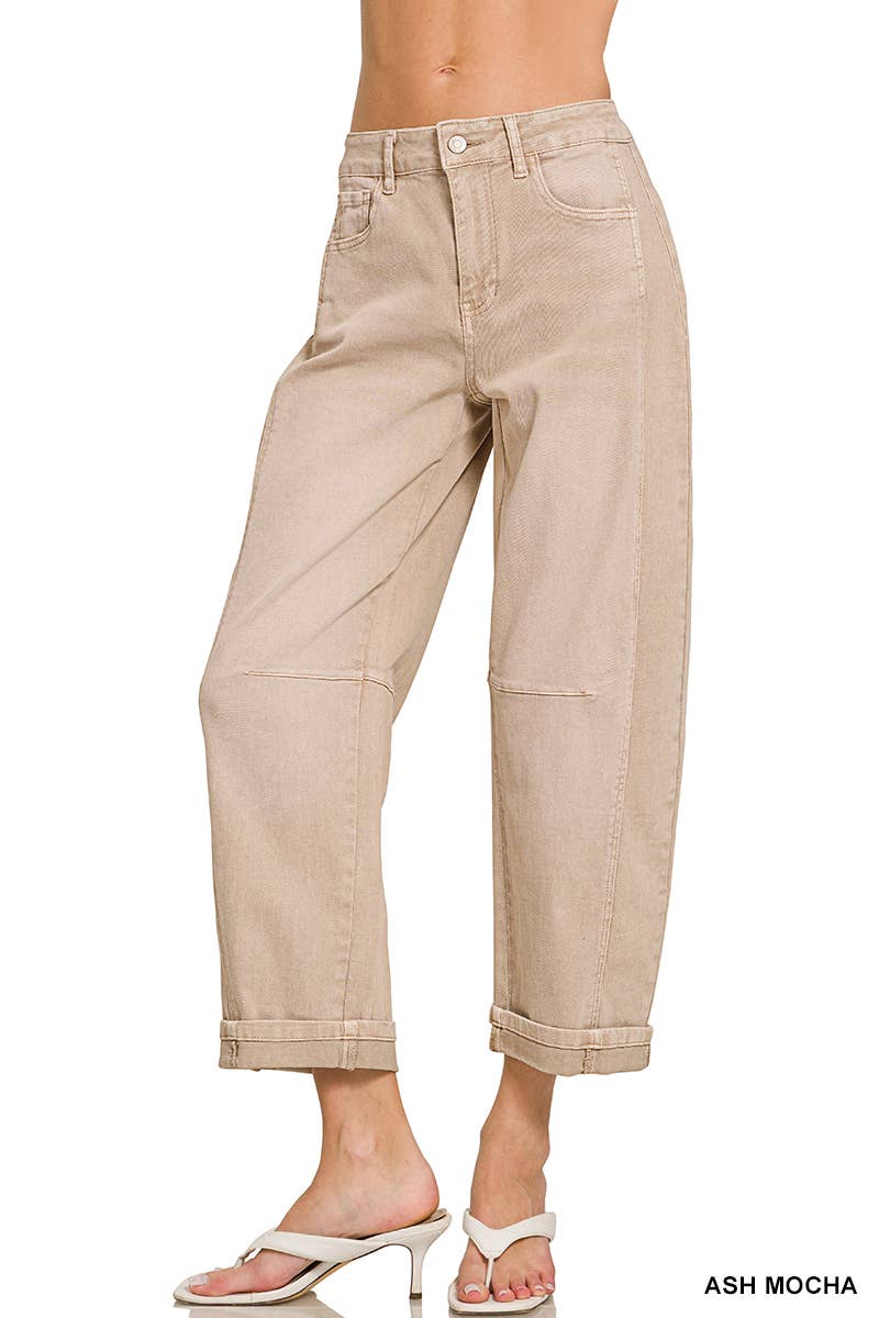 FRONT RISE: 10.5", INSEAM: 25.5" approx. LEG OPENING: 16" approx. -MEASURED FROM SIZE SMALL Material: 97%COTTON, 3%SPANDEX SI-29341 High Rise Barrel Denim Jeans (97% COTTON, 3% SPANDEX)