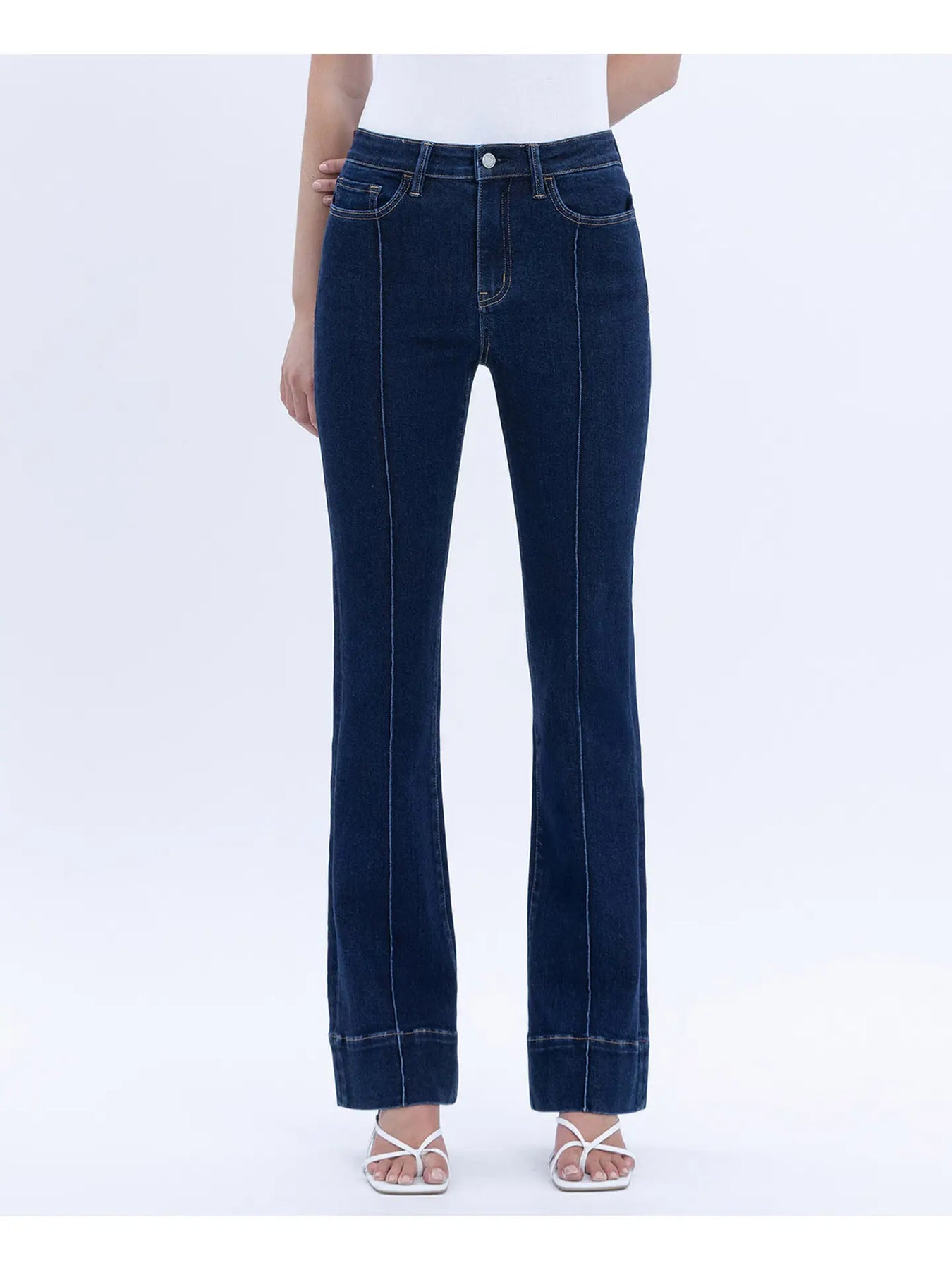 High rise pin tuck seam trouser bootcut jeans Comfort stretch denim, high rise waist, front pin tuck seam detail, full length, trouser bootcut jeans F. Rise: 10" / inseam: 33" / leg opening: 19"