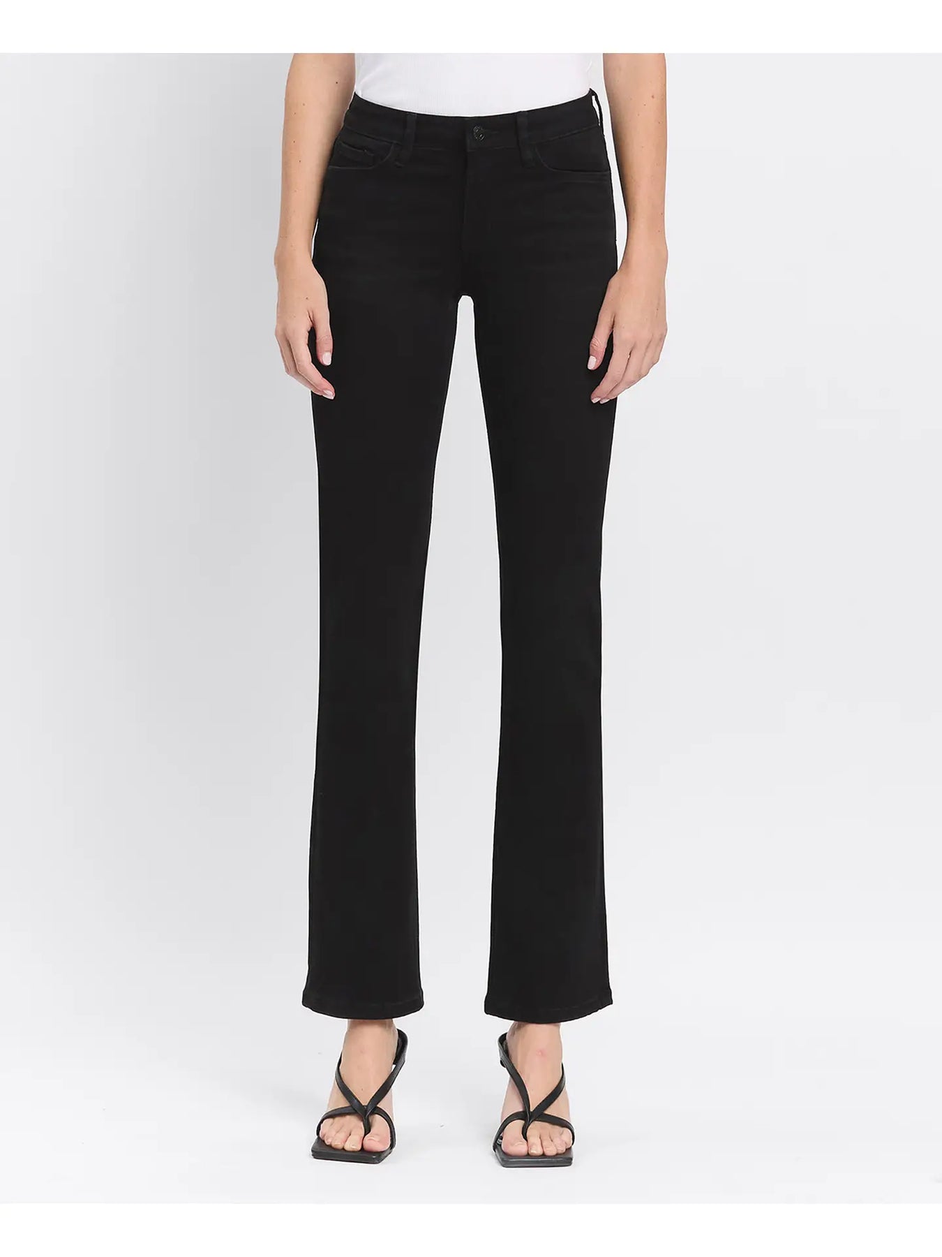 Comfort stretch denim, mid rise waist, full length, black bootcut jeans F. Rise: 9" / inseam: 32" / leg opening: 16 1/2"