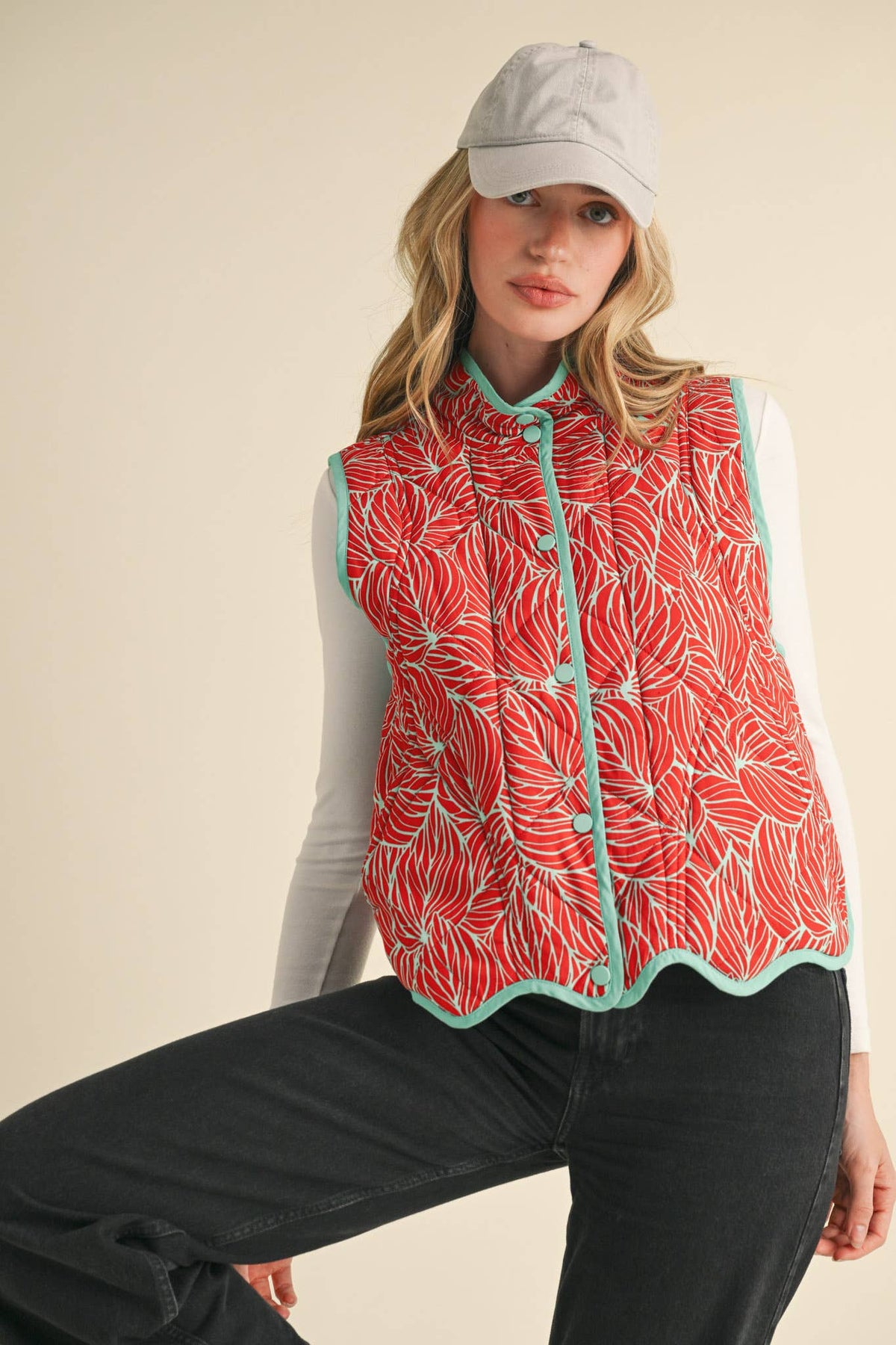 Stand out and be a style icon in this quilted vest! Quilted puffer shapes this chic vest that features a high collar, button down closure, a sleeveless bodice, and pockets. Contrast binding lines the edges and a scalloped hem complete the look.